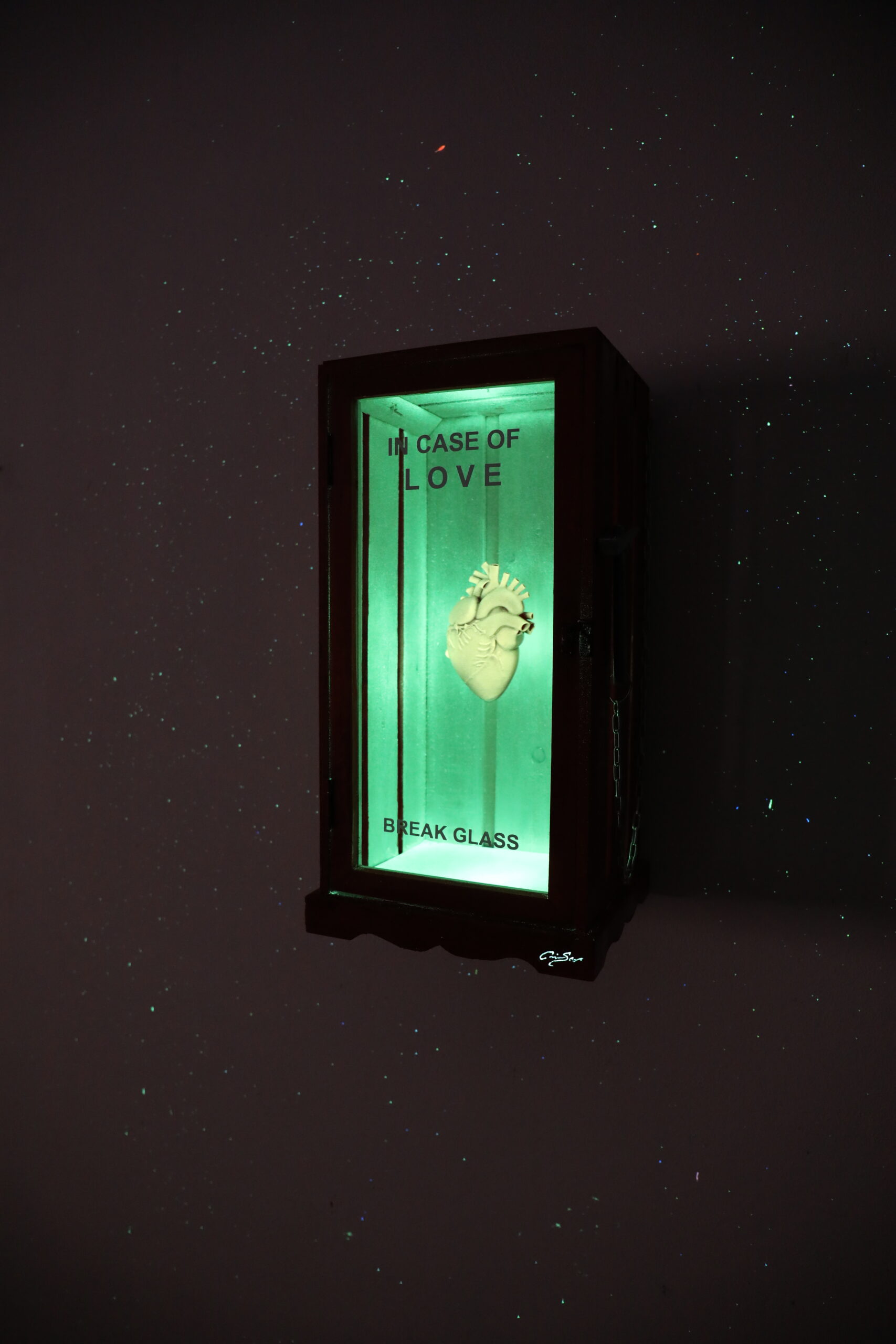 Made with a wooden box and a 3D sculpture of an anatomical heart suspended in the air. Glow in the dark!